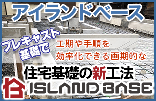 アイランドベースは、住宅基礎の立ち上がり部分を工場で生産・管理することで、工期短縮、品質向上、環境改善、効率化などのメリットを実現する新工法です。