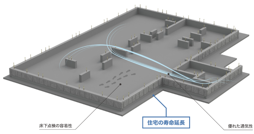 立ち上がり部分の独立化により、通気性が向上。床下環境の劣化を抑制し、床下点検時には人が見て回ることができ、住宅の寿命延長にもつながります。