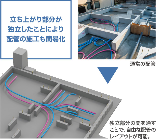 基礎の天端・外周仕上げなどの工程が不要となり効率化を実現。配管も独立部分の間を通せるので自由なレイアウトが可能です。